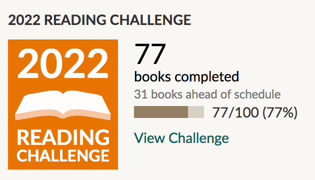 My Goodreads goal for this year (2022) is 100 books, and today on June 21st I have completed over 75 books. That equates to around 1 book read every 2.2 days.